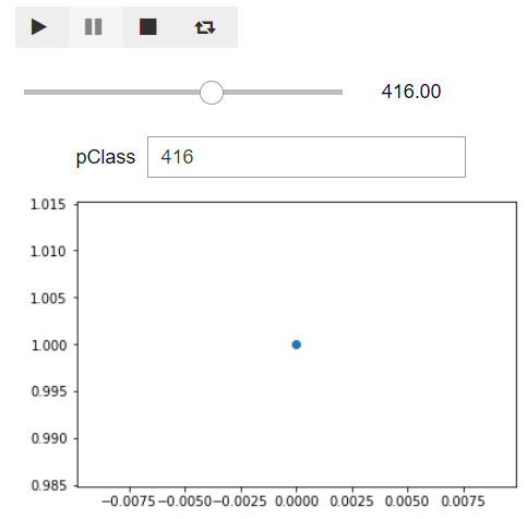 1 2 3 4 5 6 7 8 9 10 11 12 13 14 15 16 17 18 19 20 21 22 23 24 25 play = wg.Play( value=0 , min=0 , max=len(titanic)-1 , step=1 , interval=200 , description="Press play" , disabled=False ) slider = wg.FloatSlider(value=0 , min=0 , max=len(titanic)-1 , step=1 ) text = wg.FloatText( value=0 , min=0 , max=len(titanic)-1 , step=1 , description='pClass' , disabled=False ) wg.jslink((play, 'value' ), (text,'value' )) wg.jslink((play, 'value' ), (slider,'value' )) ui1 = wg.HBox([play]) ui2 = wg.HBox([slider]) display(ui1) display(ui2) wg.interact(myPlot, index=text)